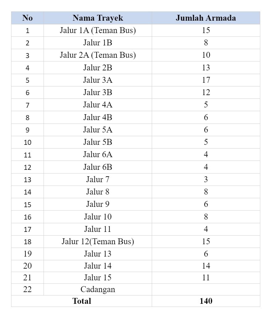 Berdasarkan dishub.jogjapriv.go.id armada bus tertotal terdapat 140 bus dengan jumlah yang berbeda-beda pada setiap trayek bus.